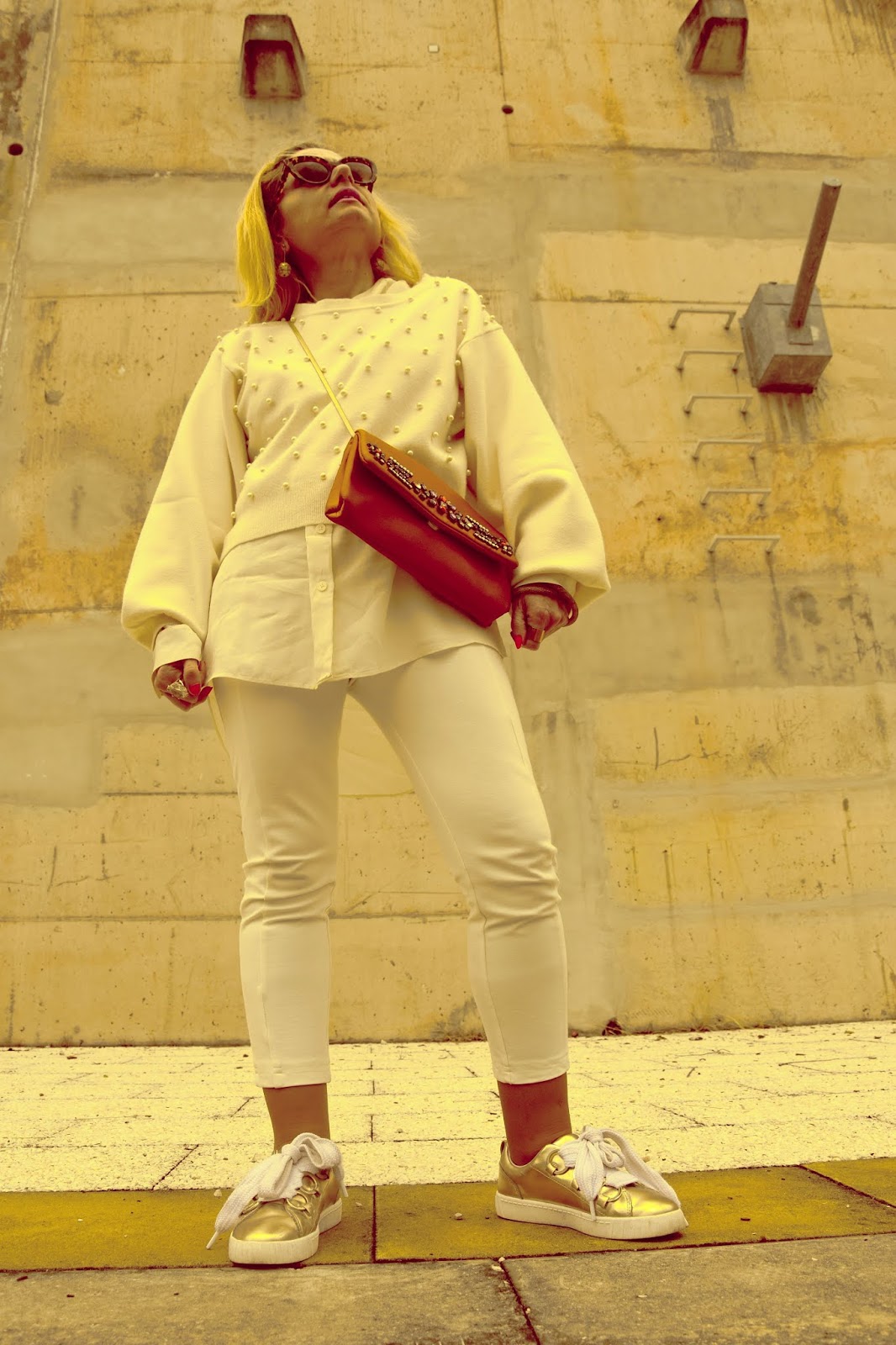 So stylish in an all white look! I love your awesome sneakers!